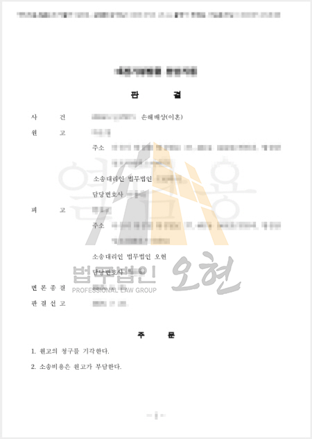 법원은 본 법무법인의 주장을 모두 받아들여, 상대방의 위자료 청구를 전부 기각하는 판결을 선고하였습니다. 본 사건은 협의이혼 이후 제기된 외도 주장만으로는 위자료 책임이 인정되기 어렵다는 점,그리고 부정행위에 대한 엄격한 입증 책임이 원고에게 있음을 명확히 확인한 사례라 할 수 있습니다.