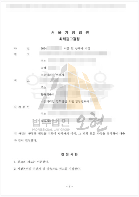 조정기일에 이 조정안이 그대로 반영되었습니다.이혼 및 친권·양육권의 배우자 귀속, 위자료·재산분할·양육비 및 소송비용 등 모든 금전 청구 포기, 향후 민·형사 상 제반 청구 금지의 부제소합의 조항까지 명문화되었습니다.의뢰인은 장기간 강제된 기혼자 신분에서 벗어나며 금전적 손실 없이 사건을 종결할 수 있었고, 상대방과의 법적 갈등이 반복될 여지를 원천적으로 차단하는 확정적 법효를 확보했습니다.