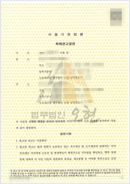 법원은 청산형 조정안을 토대로 화해권고결정을 내렸으며, 상대방이 이의를 제기하지 않아 확정되어 이혼이 성립되었습니다.